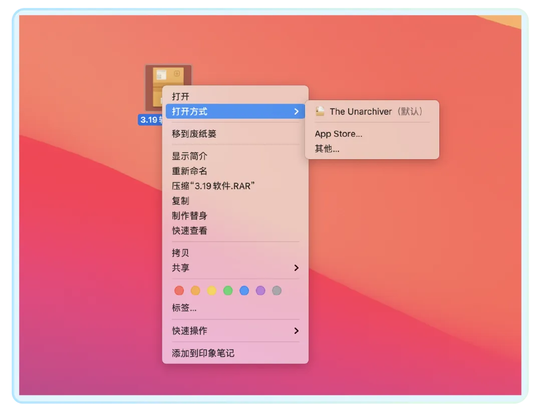 安装后,你就不用管它了,碰到 macOS 不支持的压缩包,它会以 The Unarchiver 的图标样式显示,双击它就能完成解压;点击“右键-打开方式”也能看到用 The Unarchiver 解压的功能: