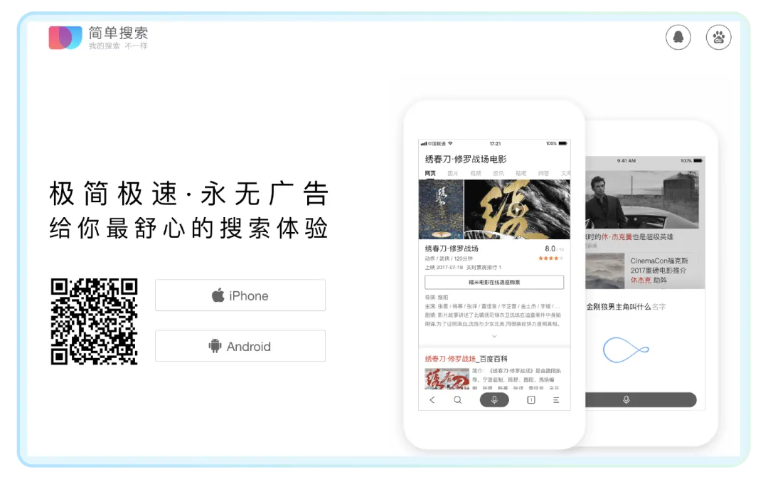 如果你习惯用百度进行搜索,强烈建议你在手机上安装“简单搜索”,你将会收获一个界面简洁的浏览器,和一个没有广告的百度。它在 iOS 和安卓上都有客户端,赶紧装起来!