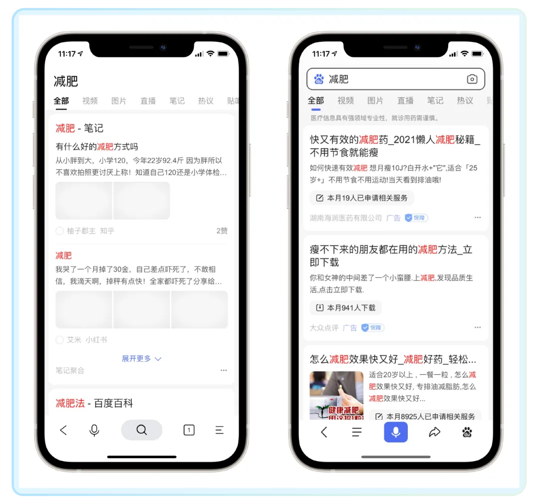 搜索结果也不同,在两款软件里同样搜索“减肥”,简单搜索的前三条结果分别是知乎、小红书、百度百科,而百度 App 里搜出来的是 3 个减肥药广告。