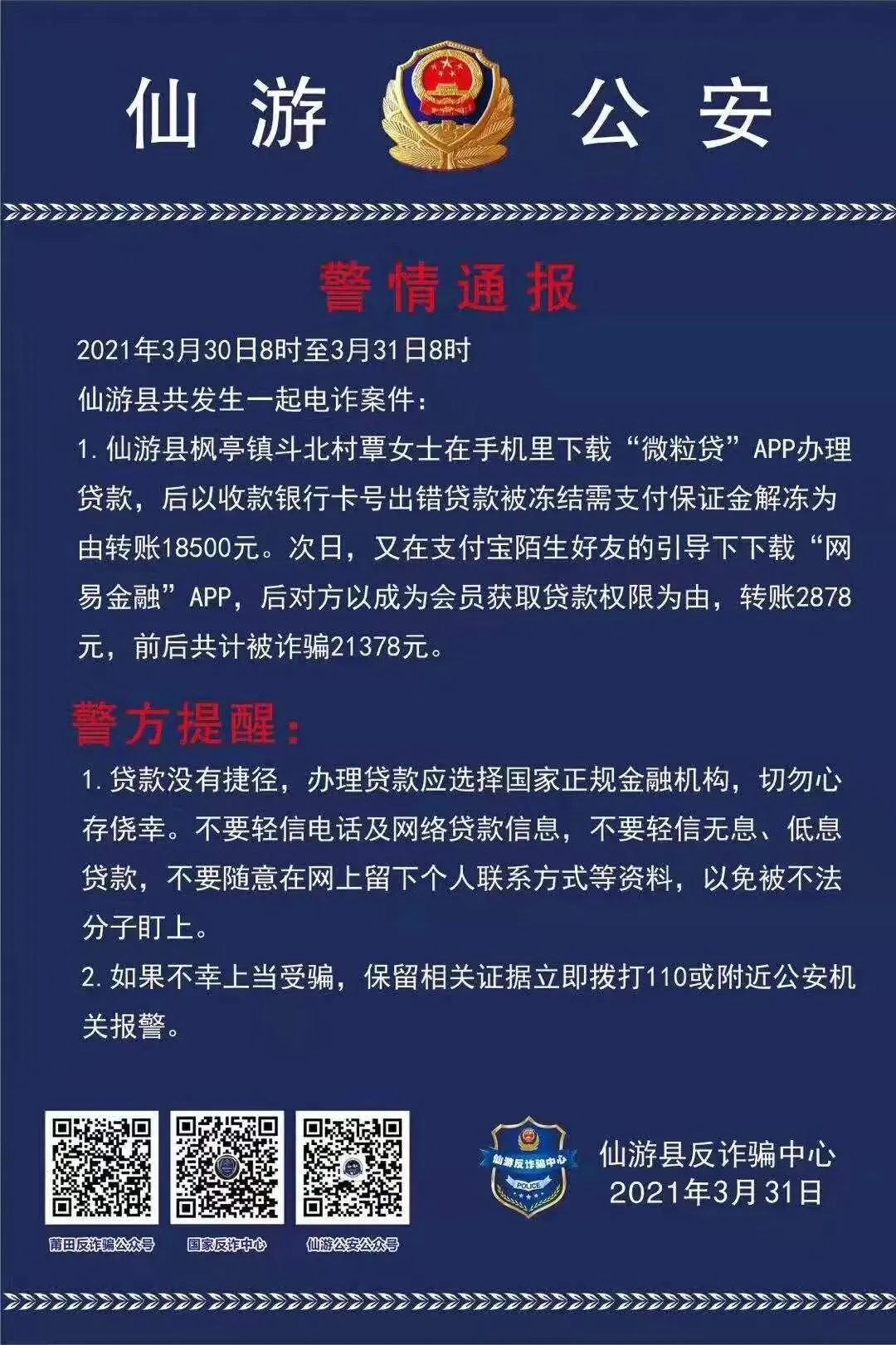 2021年3月30日8时至3月31日8时,仙游县共发生一起电诈案件: