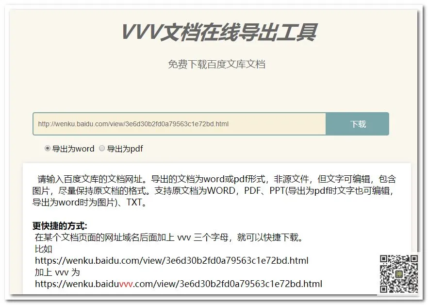 在某个文档页面的网址域名后面加上vvv三个字母,就可以快捷下载。
