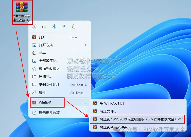 1.鼠标右键选择下载的安装包【WPS Office 2019最新专业增强版(永久激活)】,然后选择【解压到“WPS Office 2019最新专业增强版(永久激活)”】进行解压。温馨提示:win11系统需先点击“显示更多选项”,找到解压软件进行解压。