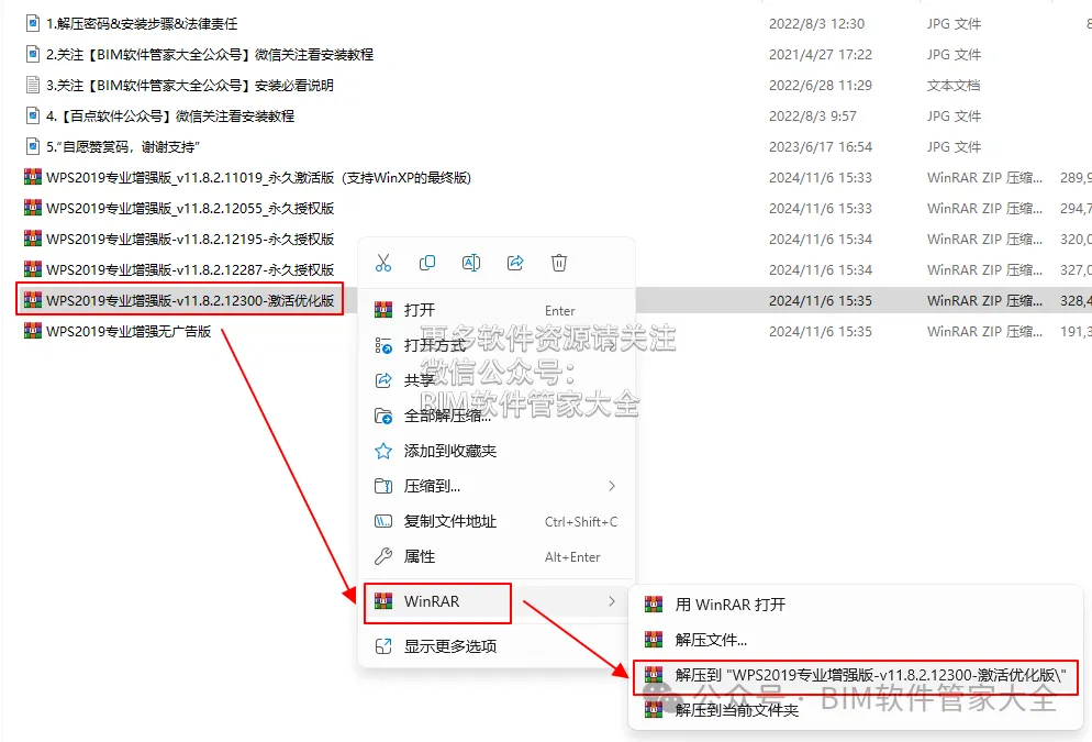 3.鼠标右键选择下载的安装包【WPS2019专业增强版-v11.8.2.12300-激活优化版】,然后选择【解压到“WPS2019专业增强版-v11.8.2.12300-激活优化版”】进行解压。温馨提示:win11系统需先点击“显示更多选项”,找到解压软件进行解压。
