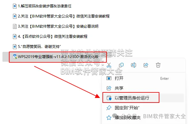 5.解压后,鼠标右键【WPS2019专业增强版-v11.8.2.12300-激活优化版】程序,选择【以管理员身份运行】。