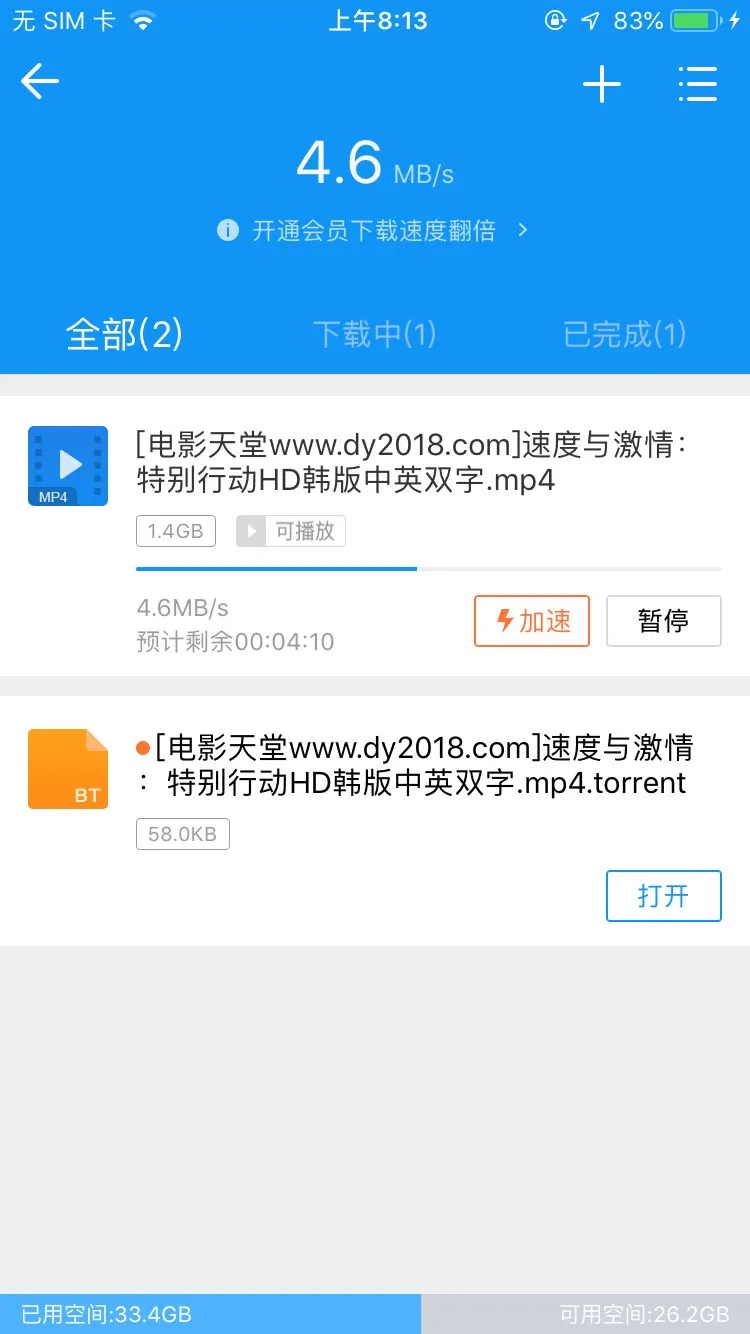 可以看到,下载最新电影《速度与激情:特别任务》速度很快,不用点会员加速,仍然享受极速下载。