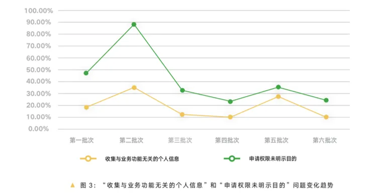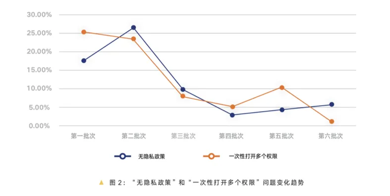 针对“无隐私政策”、“一次性打开多个权限”、“收集与业务功能无关的个人信息”、“申请权限未明示目的”四类具体问题,六批次评估中发现的问题趋势如图 2、图 3:
