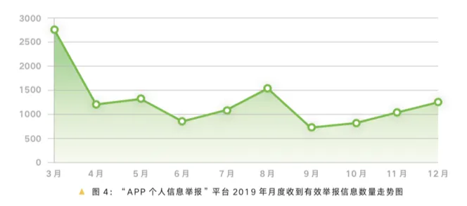 自 2019 年 3 月“APP 个人信息举报”微信公众号开通以来,每月收到有效举报信息数量呈现下降趋势,如图 4: