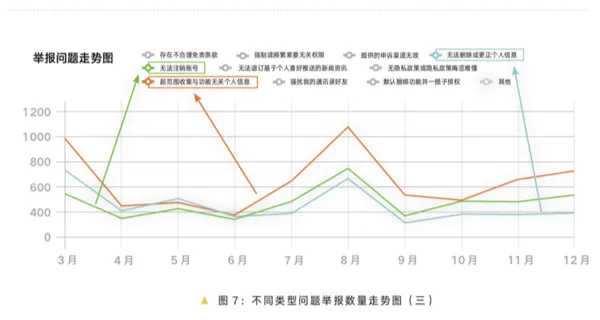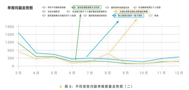 从上图可以看出, 六类举报问题中,“ 强制或频繁索要无关权限”、“ 无隐私政策或隐私政策晦涩难懂”、“默认捆绑功能并一揽子授权”三类问题举报量呈现下降趋势。 “无法注销账号”、“无法删除或更正个人信息”、“超范围收集与功能无关个人信息” 三类问题举报量呈现波动情形。