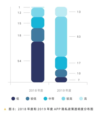 基于研究机构提供的 2018 年、2019 年 100 款 APP 隐私政策透明度评估数据,对比结果如图 8 所示: