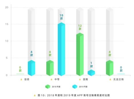 基于研究机构提供的 2018 年、2019 年 20 款 APP 账号注销难易度测评数据,对比结果如图 10 所示: