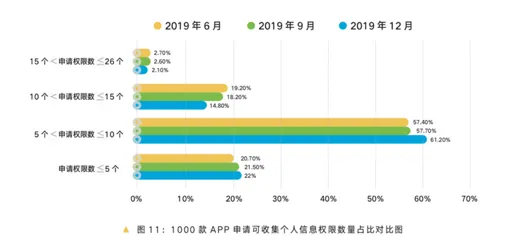 其中 50 款 APP 申请可收集个人信息权限数从大于 10 个降低到 10 个以内。至 2019 年底,1000 款 APP 中,超过 80% 的 APP 申请权限数少于 10 个。