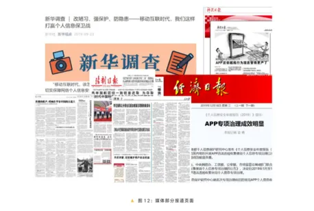 新华社在“改陋习、强保护、防隐患——移动互联时代,我们这样打赢个人信息保 卫战”报道中提到,《2019全国网民网络安全感满意度调查统计报告》显示,网民网络安全感总体提升,个人信息保护成热点。法制日报评论“APP专项治理需要进一步明确细则”中提到,通过半年多的治理 , 成效明显 , 但还需相关部门制定科学合理、可操作性强的实施细则确保治理的长效化、制度化。科技日报“APP这些越线行为现在管得更严了”一文中提到,目前下载量大的主流 APP 强制索取通讯录权限的情况已经基本消失,治理已见成效,网民个人信息的有效举报数量下降,但用户安全意识仍较淡薄。经济日报“《个人信息安全年度报告(2019)》显示:APP专项治理成效明显”报道中提到,开展 APP 违法违规收集使用个人信息专项治理以来,APP 注销难、强制索权等问题得到明显改善。