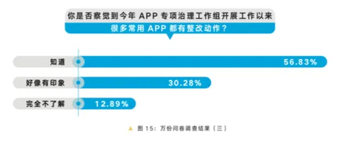 在谈及切身体验时,超八成受访者表示察觉到 2019 年以来,常用 APP 都有整改动作(见图 15)。