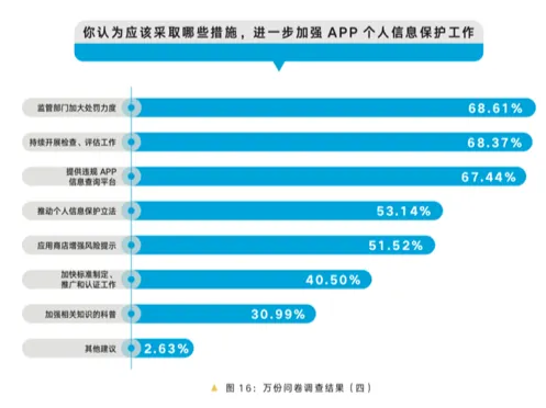 在谈及对加强 APP 个人信息保护的建议时,受访者普遍支持采取措施加强监管, 包括监管部门加大处罚力度(68.61%),持续开展检查、评估工作(68.37%),提 供违规 App 信息查询平台(67.44%), 推动个人信息保护立法(53.14%), 应用商店增强风险提示(51.52%),加快标准制定、推广和认证工作(40.50%)等。调查 结果如图 16 所示: