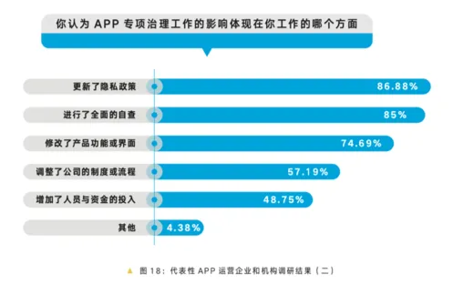 就 APP 专项治理工作响应来看,逾八成受访企业和机构表示更新了隐私政策,并根据专项治理工作发布的技术文件进行了全面的自查。调研结果如图 18 所示: