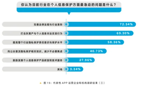 同时,逾八成受访企业和机构表示 APP 专项治理工作发布的技术文件指导性强, 对工作帮助较大。逾七成受访企业和机构表示最急迫的问题是完善法律法规与行业准则,打击灰黑产与个人信息非法买卖行为次之,接近六成受访企业认为整个行业亟待提升个人信息保护责任意识与保护水平。调研结果如图 19 所示: