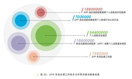 以“APP 专项治理”相关关键词进行搜索发现,包含“APP 专项治理工作组”关键词的网页约 758 万个,资讯页面约 19.8 万个;《APP 违法违规收集使用个人信息行为认定方法》相关结果约 703 万个,相关资讯约 37.1 万篇;《移动互联网应用程序 (APP)收集个人信息基本规范(征求意见稿)》相关结果约 1560 万个,相关资讯约 56.7 万篇;《APP 违法违规收集使用个人信息自评估指南》相关结果约 1880 万个,相关资讯约 16.7 万篇;《个人信息安全规范》相关结果约 5440 万个,相关资讯约 104 万篇。