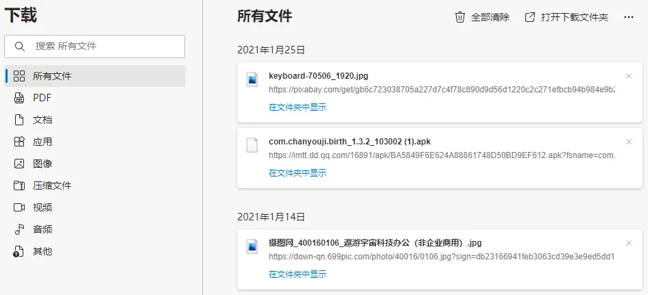 所有在浏览器中下载过的文件都按文件格式和时间顺序排列得一清二楚。