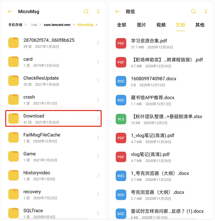 PS:由于手机系统、文件所在软件不同,所以这里只以华为手机查找微信文件为例,其他的就不进一步赘述啦,聪明的小伙伴可以百度自行探索~