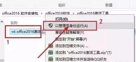 5.此时若打开Word 2016会显示需要激活,打开“Office 2016激活工具”文件夹,找到“Office 2016 激活工具.exe”文件,选中右击选择【以管理员身份运行】