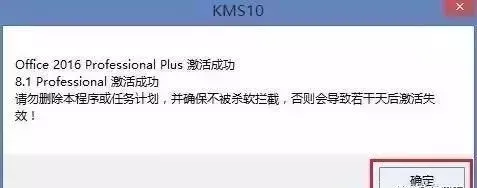 7.在弹出的提示框中显示“Office 2016 Professional Plus 激活成功”则Office 2016激活成功,然后点击【确定】