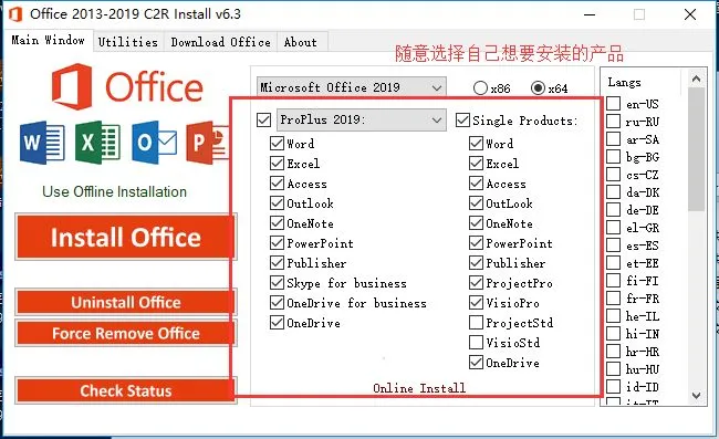 之后在主界面选择安装,首先选择2019版本(2013/2016安装方法是一样的),接着选择下面你所需要的产品,如果只是使用Word、Excel、PowerPoint这三个产品,可以只选择这三种,不必勾选所有的选项,大家按需安装就好。