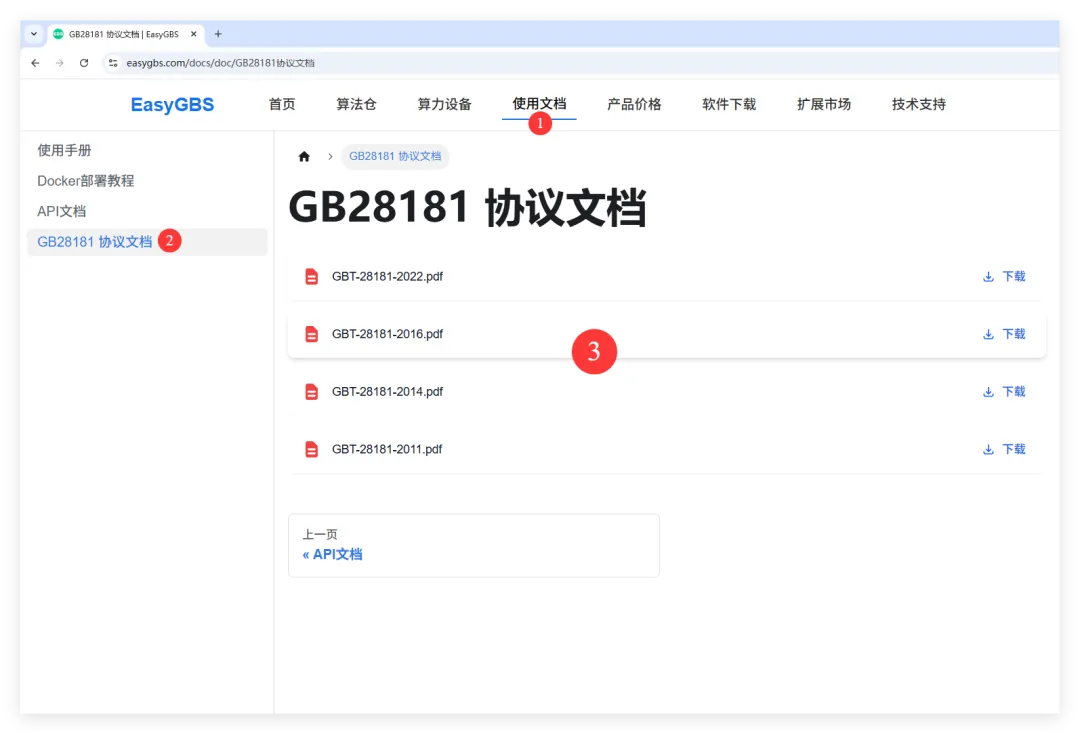 GB28181协议文档下载:GB28181-2011版、GB28181-2014修订版、GB28181-2016版、GB28181-2022版 很少有将GB28181历史以来的所有版本的协议文档都汇总出来的,今天早上我整理了一下,提供大家方便下载使用,包含了最新的GB/T 28181-2022版、现行使用最多的GB28181-2016版,以及初始的GB28181-2011版和GB28181-2011(2014修订版),下载地址放到了EasyGBS.com,大家可以自助下载,再也不用要各种积分了!