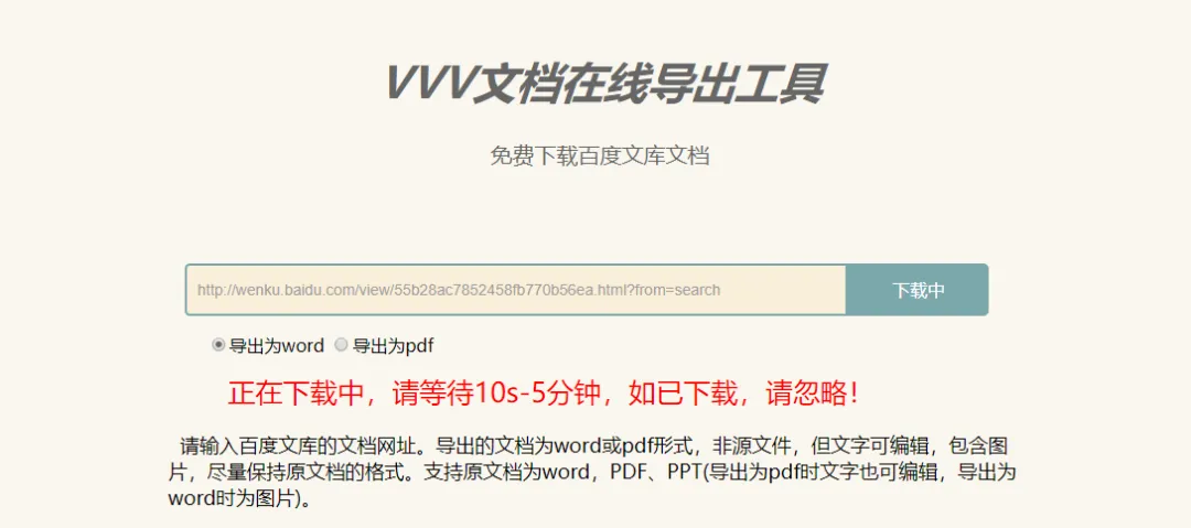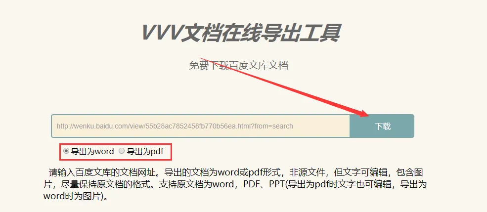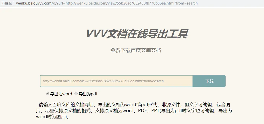 在文档页面的网址“baidu”后面加上“vvv” 三个字母,然后回车就可以跳转到这个VVV文档在线导出工具网站的下载页面