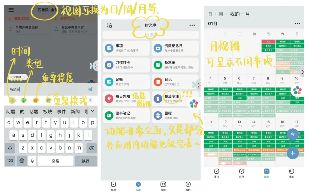 )。一个应用搞定18个大功能,待办、备忘、纪念日、课程表、目标、打卡、记账、闹钟、番茄钟、专注、信息资讯、生理期、喝水、身体健康、时间管理……功能超级无敌全面,每一个都展开描述仿佛推荐了超多APP~它就像一个陪伴在身边的私人管家,大家可以尝试利用起来!