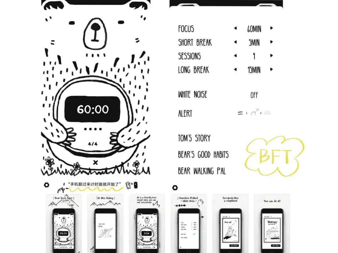 番茄钟计时+白噪音,非常简单的小应用,倒扣手机才能计时,完成目标后还有小卡片,简约的黑白设计,小熊非常可爱~