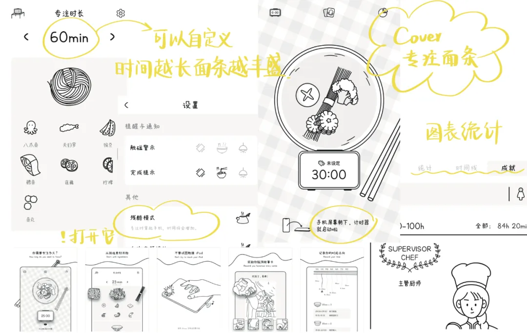 专注可以做一碗好面条,开启你的大厨之路~也是非常简单的小应用,倒扣手机才能计时,完成目标后还有简单的脑洞卡片,很可爱~