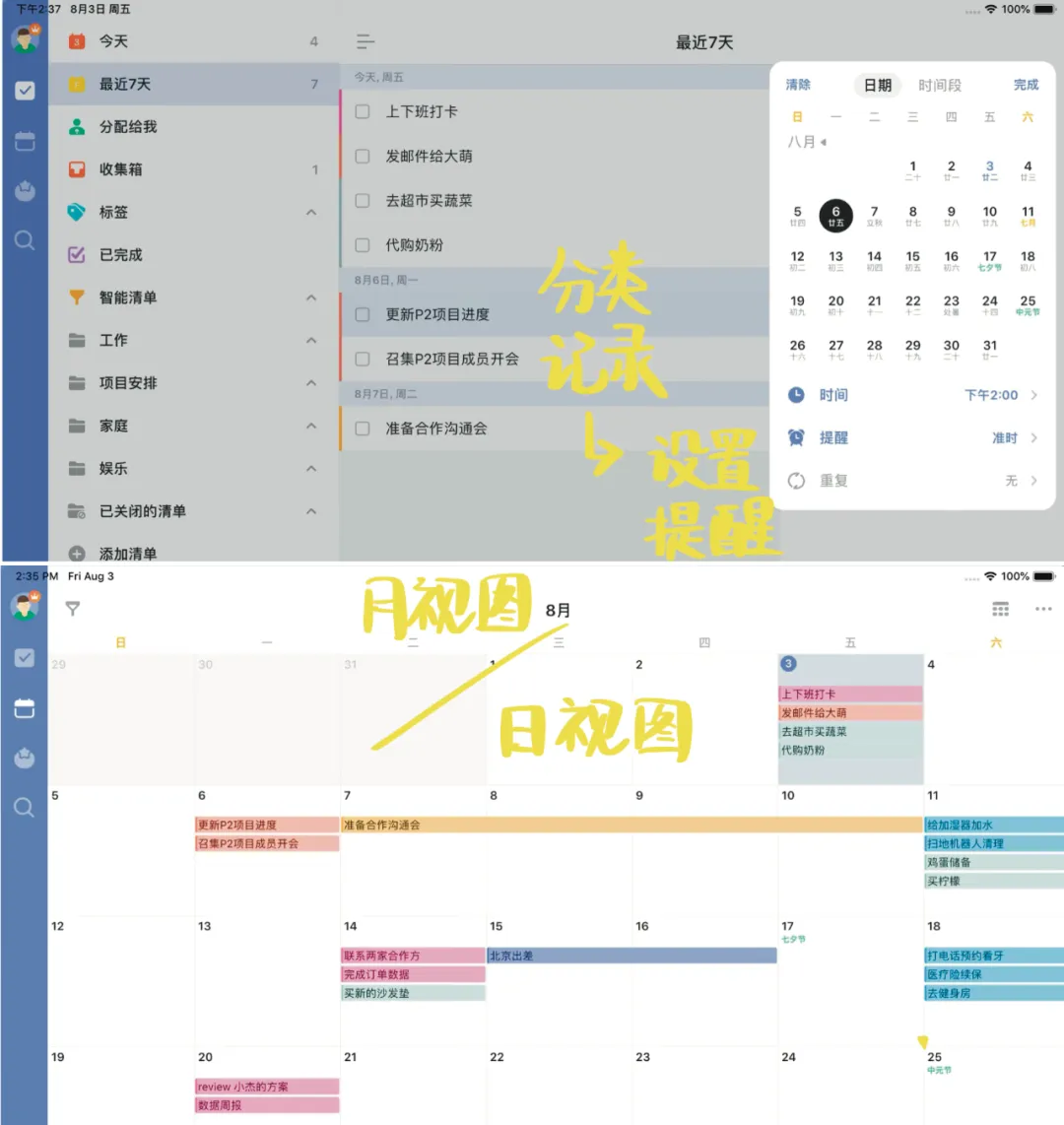 简洁轻便的一款待办事项和日程管理APP,有计划表、备忘录、日程清单、闹钟、番茄钟等,也有数据统计以便复盘。
