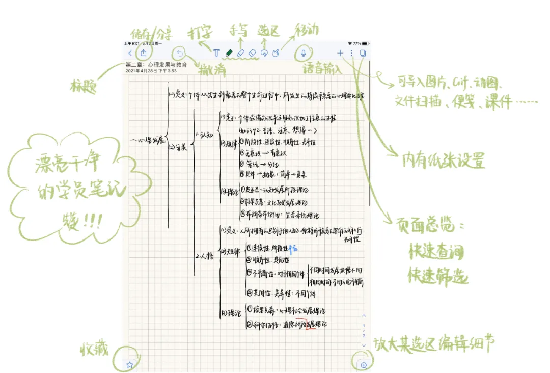 思维导图制作工具,操作简单,用来做笔记、梳理框架和整理思路都非常不错。可以灵活展开和收缩小分支,复习时可以将具体内容收缩,看着大框架回忆和填充知识点。