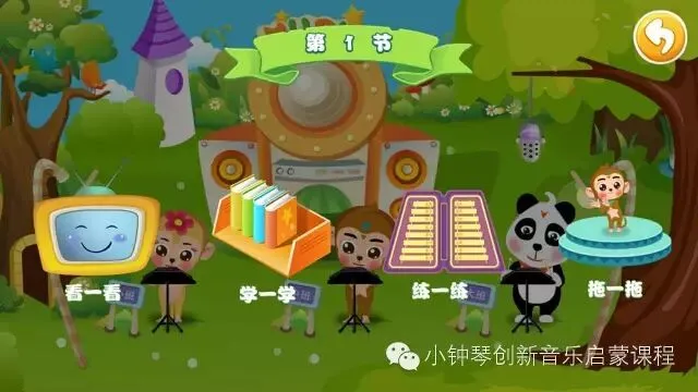 小钟琴创新音乐启蒙多媒体软件课程最大的亮点是:根据每节课的教学目标与要求,设计包含动画故事、演示图片的多媒体课程。让主体教学,国学文化,复习回顾,演奏练习,知识巩固都通过多媒体演示出来,大大减轻了老师的备课压力,提高了小朋友学习音乐的兴趣。