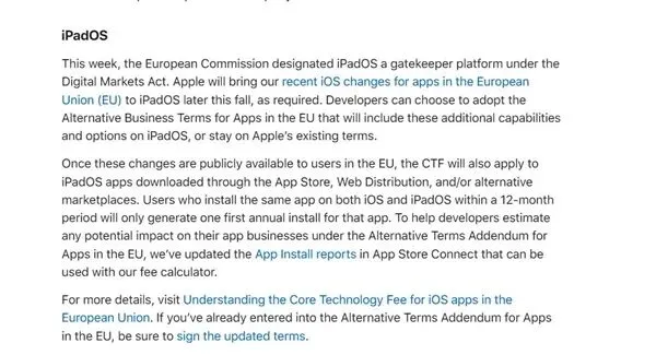 5 月 5 日,苹果官网发布了一则开发者公告,宣布计划在今年晚些时候为欧盟地区的 iPad 开放侧载功能。