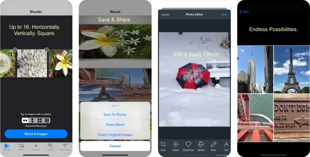 支持两张四张九张图片进行无缝渐变拼接,拼接的混合百分比可以手动修改。