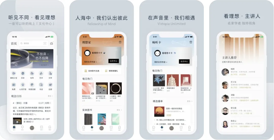首屏包括垂直细分、新手必听、历史、社科、艺术、文学、音乐、电影、心灵疗愈、轻松陪伴、视频、有声故事等等。