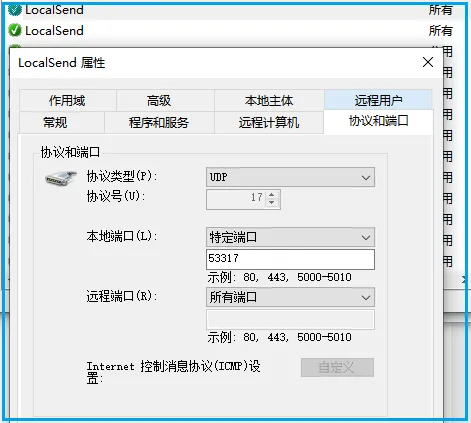 电脑端因为涉及到数据入出站,所以要在防火墙上放行相应端口。localsend 所使用的端口为 53317 既用到了 tcp 端口,也用到了 udp 端口。Windows 端口的软件也提供了自动添加防火墙规则,在故障排除选项中点击 “自动修复” 会运行一个修复脚本自动添加防火墙规则。