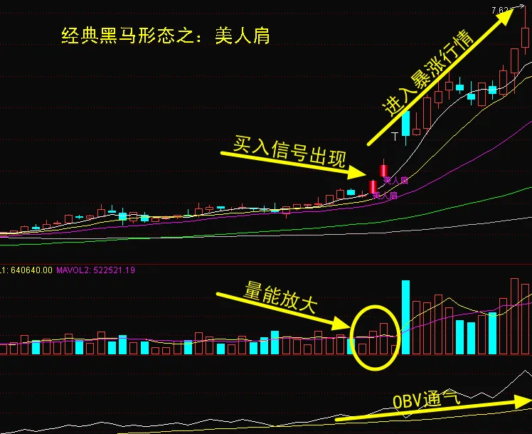 入场点:信号出现当天尾盘或次日回踩肩膀(A 点)不破。