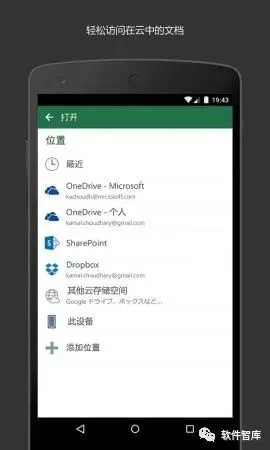 4.随时随地打开文档,您可以把文档存储在OneDrive、OneDrive for Business和SharePoint上,并随时使用多种设备轻松访问。
