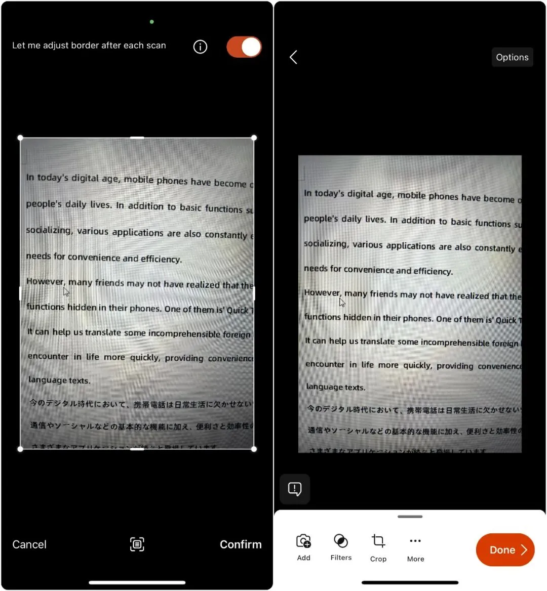 自动裁剪和校正功能确保扫描文档保持正确的比例和方向,同时用户还可以进行裁剪、旋转、增强等操作以满足不同需求。