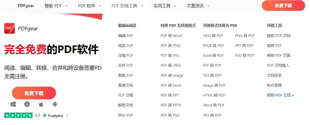 PDFgear是一款优秀的PDF编辑工具箱。支持将 20 多种文件格式转换成为 PDF、PDF/A 与 TIFF – Windows 与 Mac 系统上的 doc(x)、xls(x)、ppt(x)、msg、outlook 电子邮件。将 PDF 转换成为可编辑文件,包含 Microsoft Word、Microsoft Excel 与 Microsoft PowerPoint,或将 Microsoft 365 文件转换成为 PDF 而不会丢失任何格式。