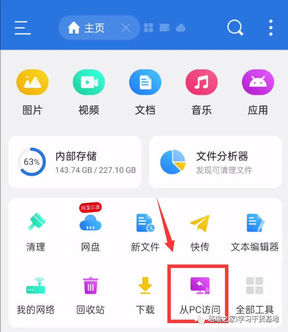 安装好后,打开【ES文件浏览器】,点击下图中的【从PC访问】。
