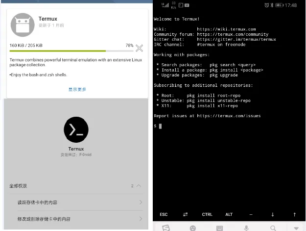 官网中可以看到推荐的下载方式是Google Play 和F-Droid。Google Play在手机上安装太麻烦了,所以推荐F-Droid,虽然它比较慢…当然你可以离线下载Termux的apk文件,虽然这样没办法获取更新。安装果果橙比较简单,下载F-Droid,完成安装后搜索Termux,下载即可。