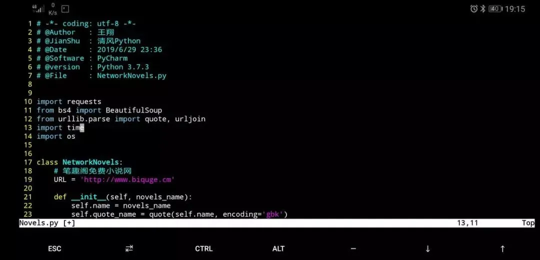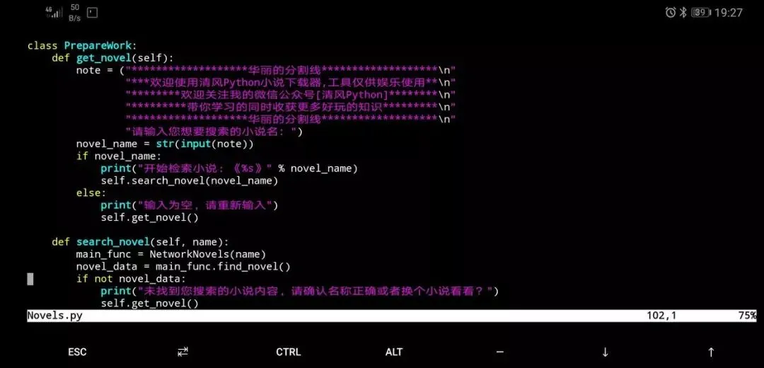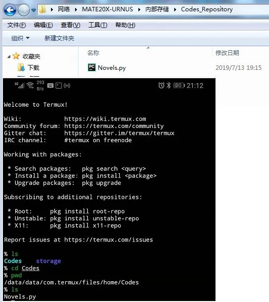 然后,我们将小说下载器的脚本Novels.py丢到手机的Codes_Repository,再去Termux中看看是否同步