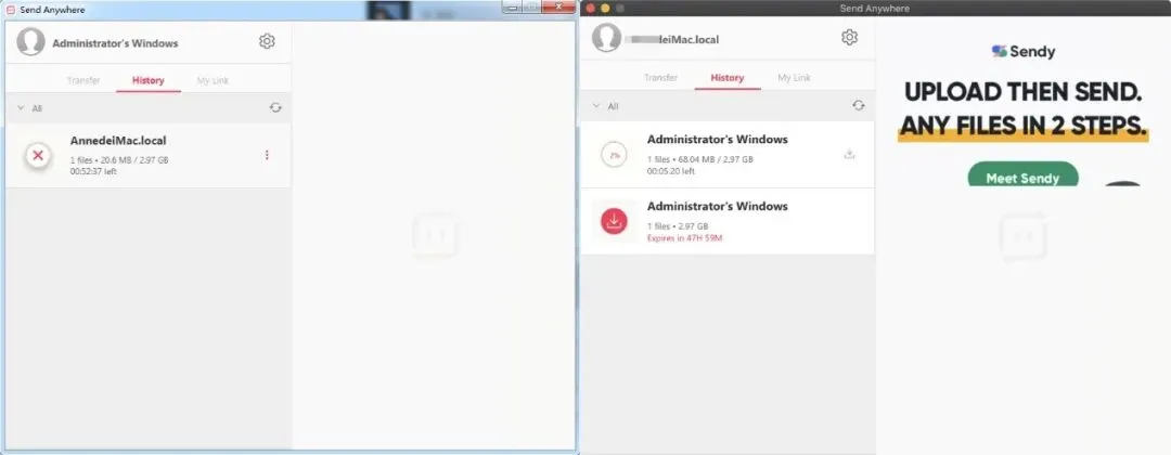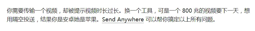 而Send Anywhere在不同的电脑系统之间传输文件时,传输速度并不能让人满意,近距离传输的便捷度也不及另外两款。或许远距离传输才是这款软件的真正使命。