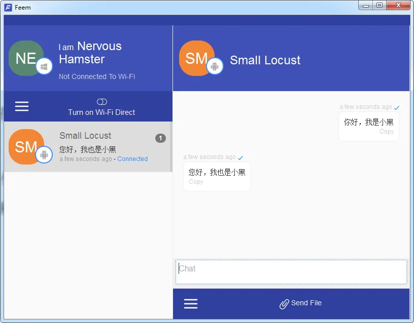 使用Feem传输文件还是比较简单的,在点击连接上的设备图标之后,可以看到一个类似聊天窗口的界面。用户可以直接将文件拖到窗口中开始传文件,也可以用来和已连接上的设备聊天。