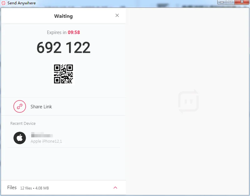 Send Anywhere传输文件的方式则有所不同,在选定要传输的文件后,发送端会自动生成一个6位数的密钥。用户在接收端输入这个密钥,来接受文件。