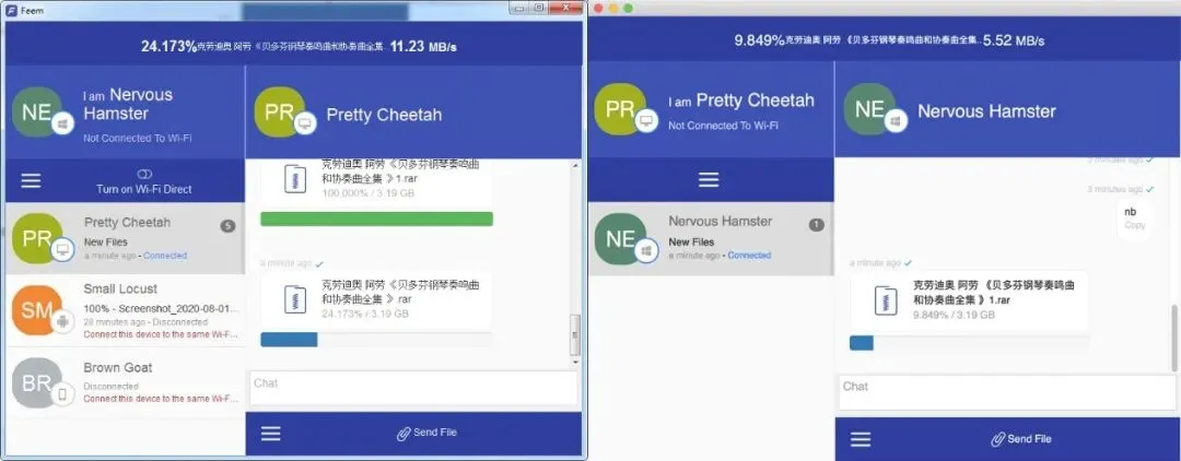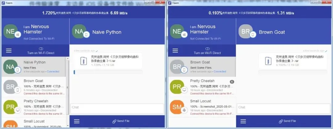 Feem使用的是局域网直连的方式进行传输。在连接其他设备时,要先保证两台设备接入同一个局域网。Feem会自动搜索和登录设备在一个局域网内的设备。