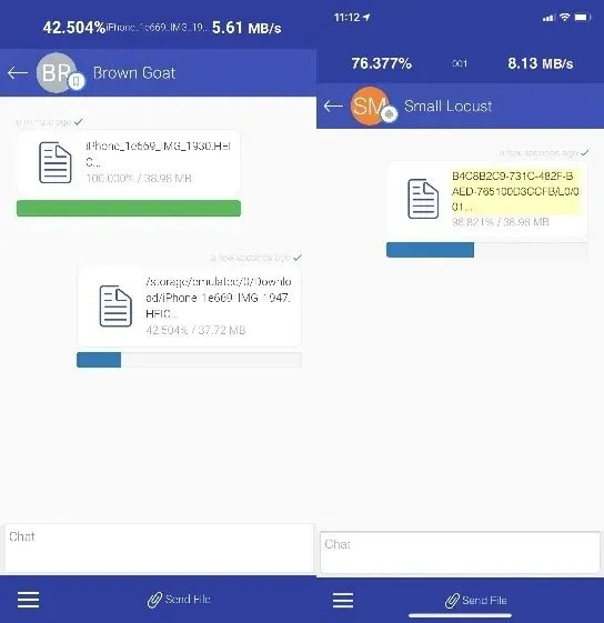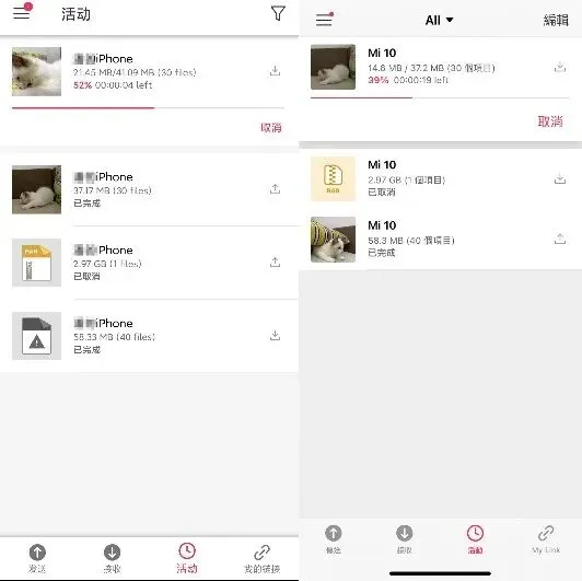 接下来小黑测试的是iPhone和安卓手机互传。由于手机端互传文件大多是以图片为主,小黑就分别选择了30张图片进行测试,文件大小共40MB左右。下图中,左边是安卓传输到iPhone设备,右边则是iPhone传输到安卓端。